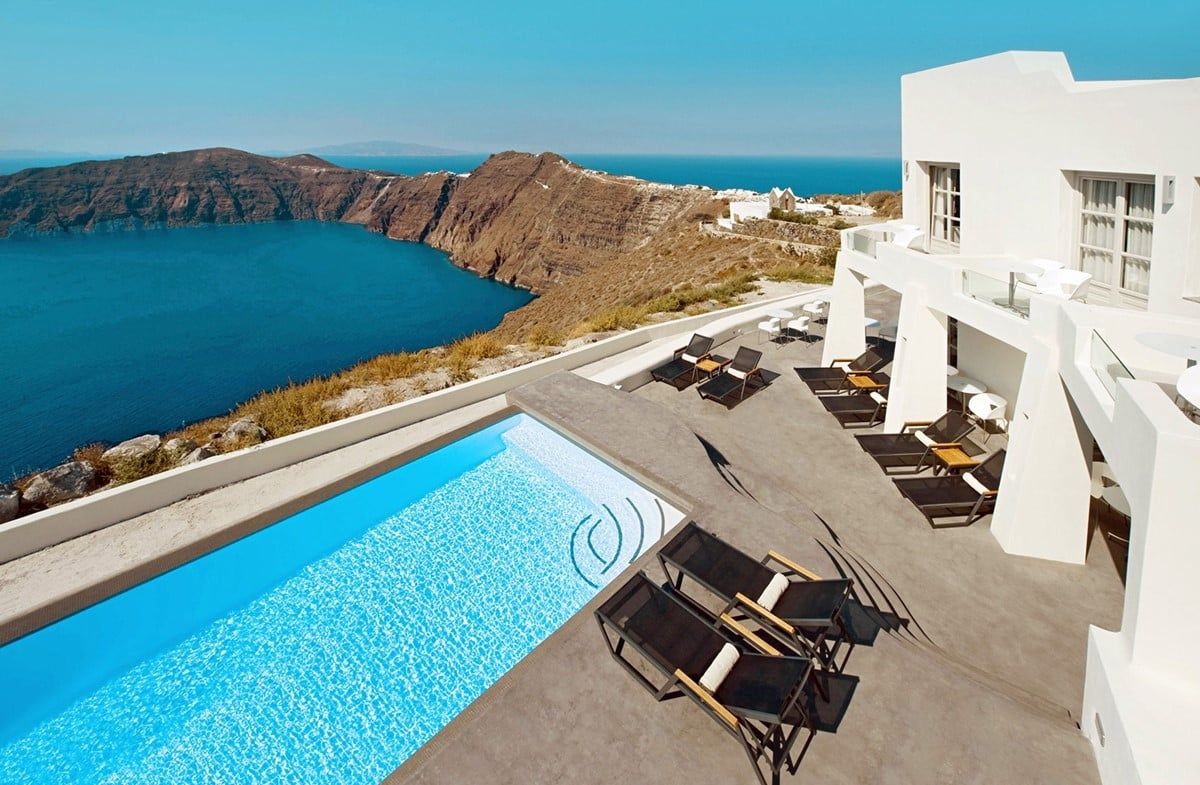 Dit adults only-hotel aan de kraterwand van Santorini is een droom voor koppels en honeymooners, die hier de hemelse rust vinden om te genieten van elkaar en van het onweerstaanbare natuurdecor van de caldera. Ook het zicht van in de infinity pool is één en al azuurblauw water en vulkaan. De spa verwent u met een resem wellnessbehandelingen, maar dan wel in een uniek decor met prachtige panorama's. En hebt u toch behoefte aan wat drukte, dan is het amper twee kilometer lopen naar het stadje Fira met zijn smalle straatjes, winkeltjes en terrasjes.